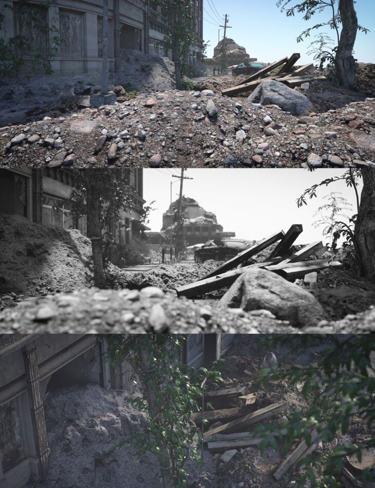 A distant ruin and car wreckage, plus 5 unique props, with 3 resolutions each, ranging from detailed 300k to 20k, giving you a total of 16 props to populate your mayhem.