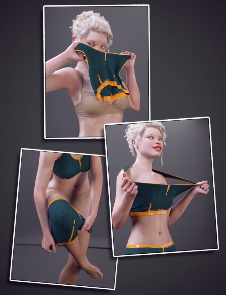 Undress and Get Dressed Poses is a stand-alone pose and clothing package that includes 10 different dress/undress poses and 2 versatile clothing items: a racerback top/bra and boyshorts.