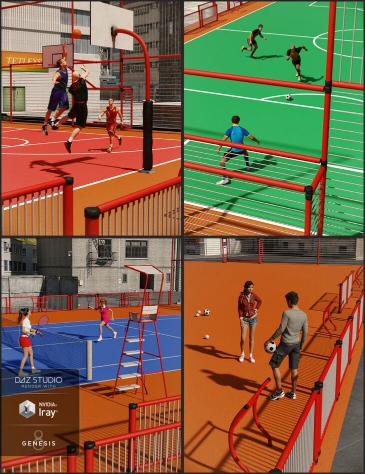 Set of three urban playgrounds, tennis, soccer (football) and basketball with corresponding accessories.