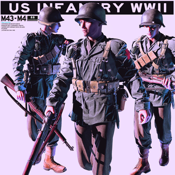 US GI WWII late war uniform (dec. 1944-1945), 28th Infantry Division for Michael 4. The M-1943 Jacket and Combat Boots were introduced in combat late war starting from november 1944, in the Ardennes, Belgium, Holland, Germany. He wears the M-1936 musette usualy used by paratroops, officers and mechanized troops. His haversack has been left aside for a quick assault loaded with ammunition bandoleer and bags.