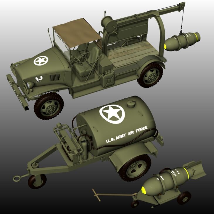 Bundle made for Poser with a character ( CHEVY_BOMB_SERVICE_TRUCK) and 2 props ( AIRCRAFT_TANK_TRAILER and WAGON_and_BOMB).
