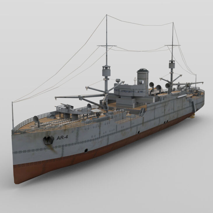 The USS Vestal model includes over 30 moving parts, such as: guns, cranes, turrets, spotlights, and propellers.