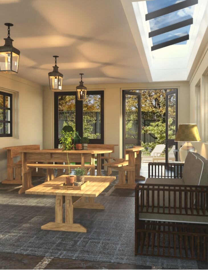 Nothing is more relaxing than waking up and having breakfast in this beautiful sunroom inspired by Utah architecture. Open the large doors on both sides of the room and feel the breeze from the green garden outside.