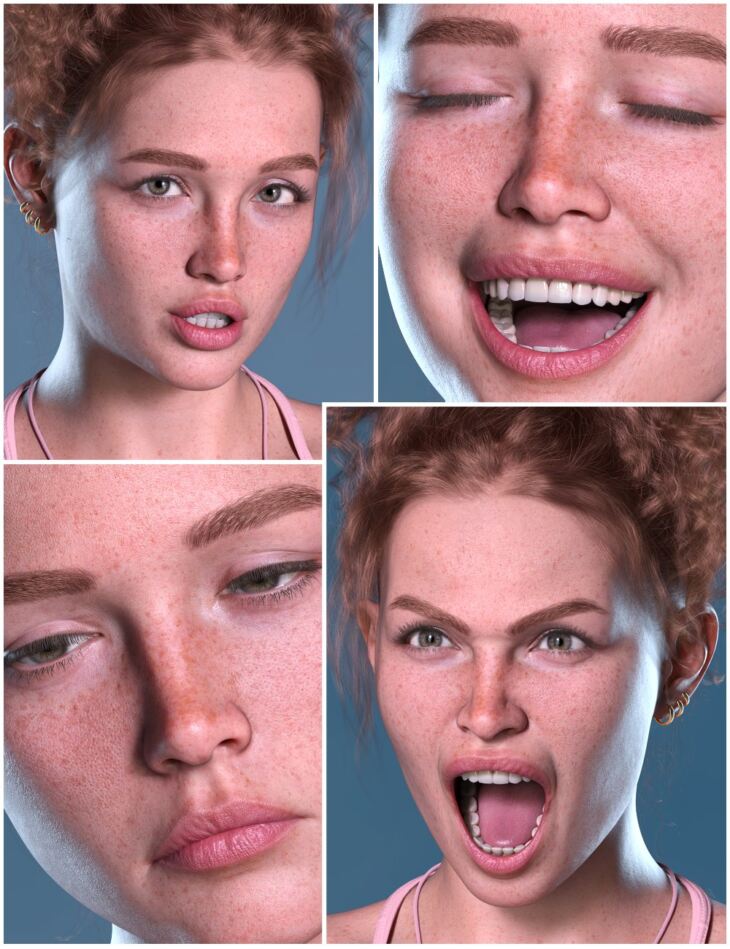 There are 100 full facial expressions, 100 upper facial expressions, and 100 lower facial expressions for your scenes and renders.