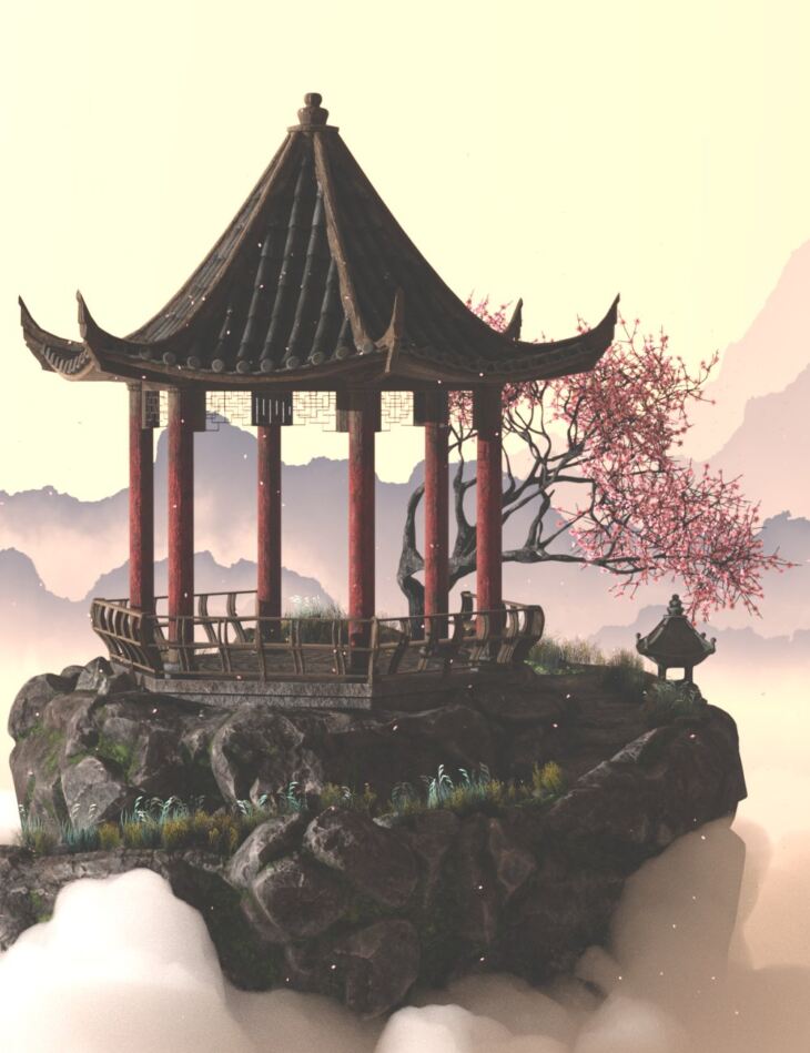 This pagoda, floating amongst the clouds, was inspired by Asian tales and paintings. V176 Iray Pagoda Diorama contains the background, the lighting, and the cloud, so a scene can be set with just a few clicks - all that is missing is your character!
