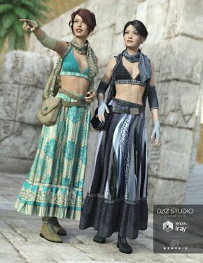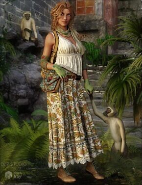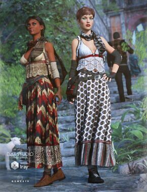This beautiful 3D boho-style outfit for Genesis 3 Female(s) has everything you need to create a great new look including a skirt, boots, camisole, belt, scarf, elbow bracers, gloves and a backpack.
