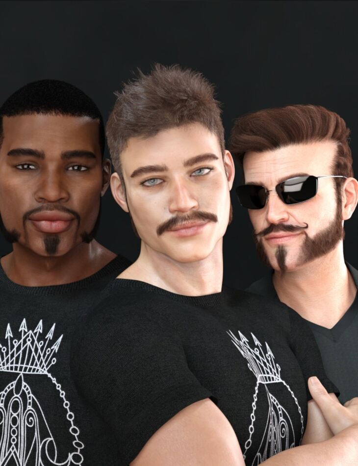 ariety Facial Hair for Genesis 8 male consists of nine individual facial hair pieces, including four moustaches (Copstash, Fu Manchu, Winnfield and Handlebar), mutton chops, cheek hair, a soul patch, a beard and eyebrows.
