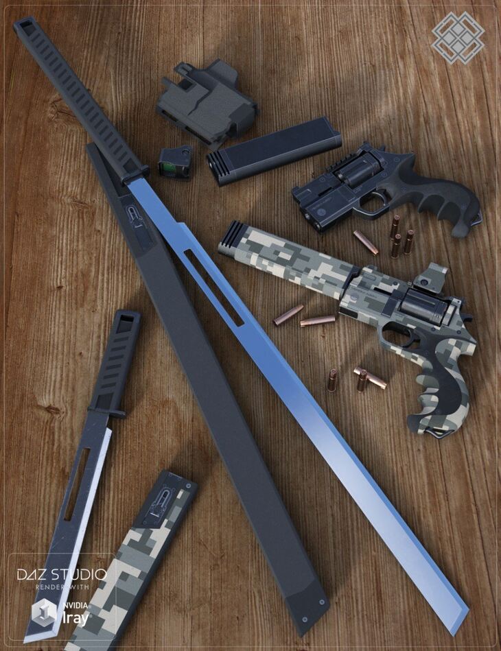 This set includes a conforming holster with a gun, sight, muffler, bullet, bullet sleeve, sword with a scabbard, knife with a scabbard, 2 guns (smart props) - for left and right hand. Gun with moving parts and laser.