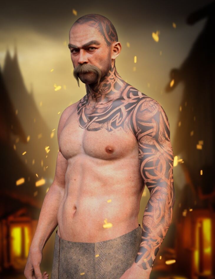 Viking Tattoos for Genesis 9 is a geoshell tattoo set covering a full sleeve and head. There are 4 different styles to choose from, so get creative with your Viking characters!