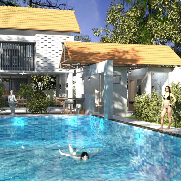This modern villa with a pool is perfect for your characters to take a dip in the water, or just relax like on a holiday, or hold a pool party and invite your friends over.