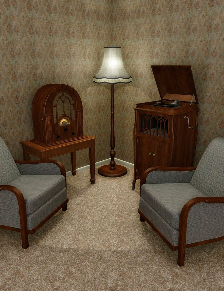 A selection of vintage furniture props from the first half of the 20th century. Props include phonograph and record, cathedral radio, small table, standing lamp and deco chair.