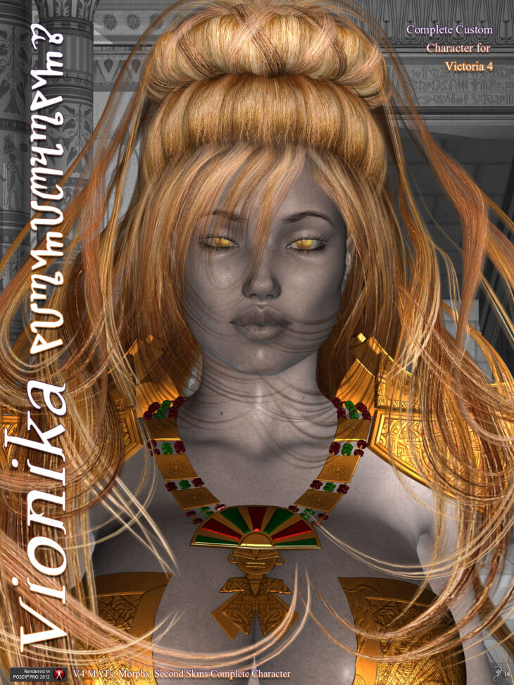 Vionika is a complete sci-fi character package for creating the techno-beauty and priestess of Tekkra for V4. Fully equipped with morphs, props, textures, and poses, this pack features everything you need to bring this otherworldly demi-goddess to life!