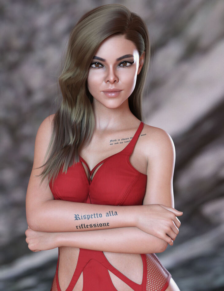 The product Also comes with 4 tattoos, 3 are LIE and 1 is a Iray Decal. Fibermesh Lashes are Included. She also comes with a smile expression.