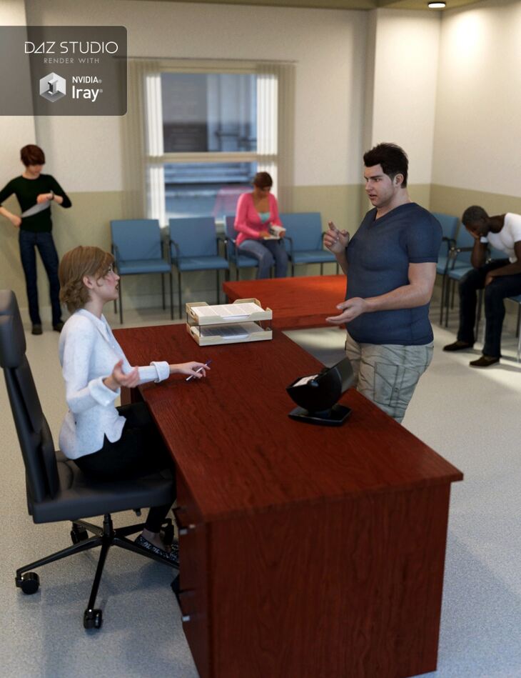 Waiting Room is a detailed set that includes a desk, desk chair, waiting room chair, table, and interior. The Interior, chairs, desk and table load separately. Also includes a full scene pre-load preset.