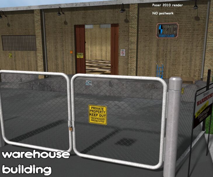 A high detailed Warehouse building exterior scene with a basic interior. Day-Night option with a python script.