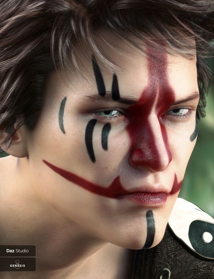 Warrior Make-up is a collection of painted make-up overlays that work with your favorite Genesis 8 Male Character textures.
