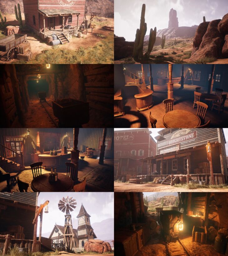 Complete western desert environment with over 340 models including modular buildings, cave and mines, large set of props, furniture's, nature assets, and dynamic day/night cycle with rain options.