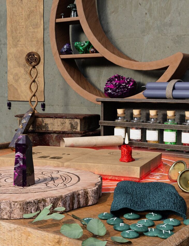 From a Wiccan board (with two emissive child props) to ancient books, candles, wand, dreamcatcher, gems, and runestones, you will find everything you need to add that Wiccan touch to your renders.
