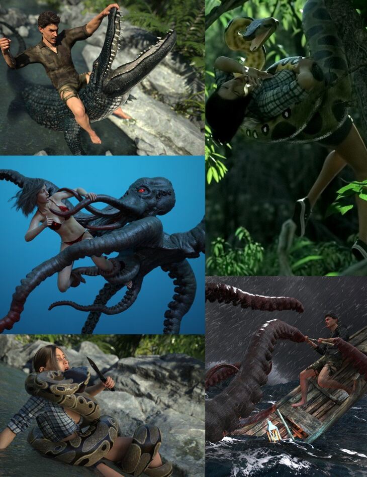 Need help posing your Alligator, Constrictor, and Horror? Look no further than Wild Journey Pose Part 2! Let the exploration begin with 32 interactive poses for Alligator and Genesis 8 Characters, 30 interactive poses for Contstrictor and Genesis 8 Characters, and 60 interactive poses for Horror and Genesis 8 Characters