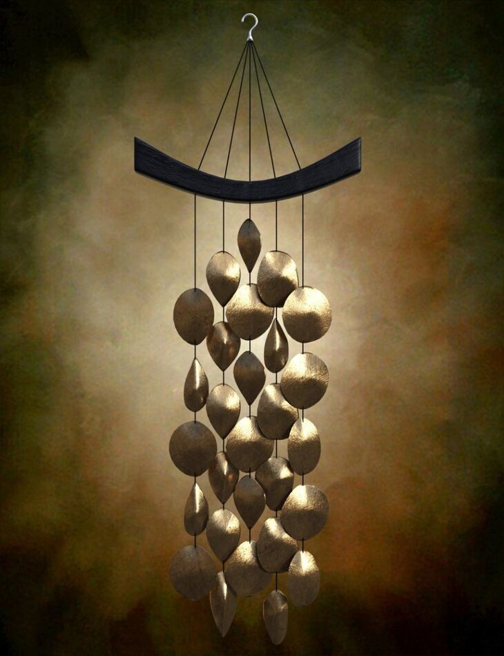 This is a set of 10 wind chimes in various styles, materials and colors including metal, porcelain, wood and glass.