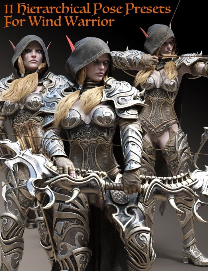 11 Hierarchical Poses with bow and arrow for products Wind Warrior Outfit with dForce for Genesis 8 Female(s) and Wind Warrior Hair with dForce for Genesis 8 Female(s).