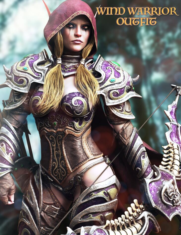 Wind Warrior Outfit combines full-body iron armor for fighting on battlefields with sexy leather outfit ( corset, trousers and gloves) for celebrating days of peace. dForce cloak and bow are rigged.