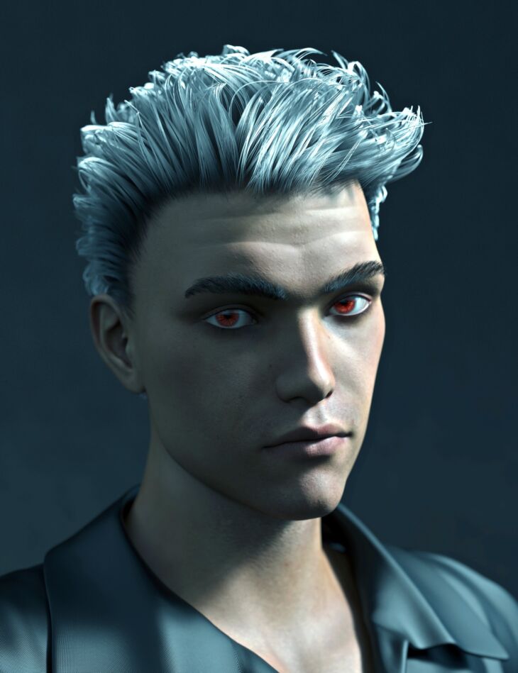 He comes with anatomical element maps and an HD Neck Scar. Subd4+ is recommended for the HD morphs. He's got some fantasy eye options to show off his darker nature.