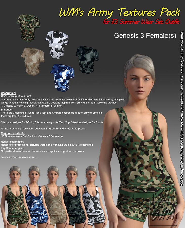 WM's Army Textures Pack is a brand new IRAY only textures pack for i13 Summer Wear Set Outfit for Genesis 3 Female(s).