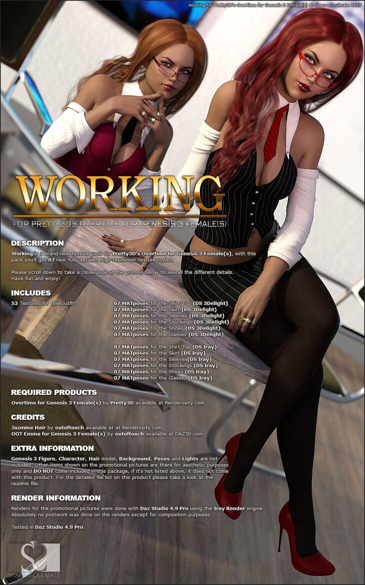 Working is a brand new texture pack for Pretty3D's Overtime for Genesis 3 Female(s), with this pack you'll get 7 new fully detailed high-resolution texture styles.