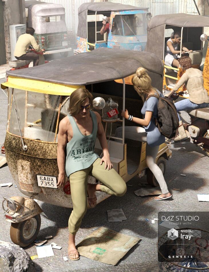 Traveling the world was never so easy, or so harrowing. Let your Genesis 3 characters travel like the locals with these poses crafted for the Auto Rickshaw and the Moped models. Poses include both male and female versions as well as driver and passenger positions.