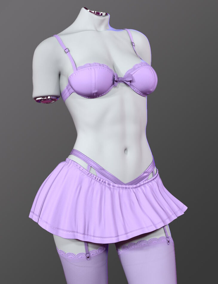 X Fashion Melody for Genesis 9 is a cute four-piece lingerie set consisting of a bra, panties, stockings, and a skirt and comes with 14 color options. Also comes with a custom material to Colorize and pick any color you like.