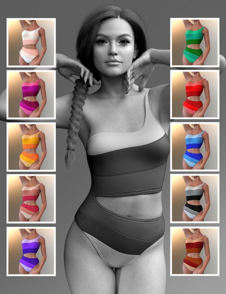 This package includes a Bikini Top, Bikini Bottom, and Swimsuit with 10 colors for each piece.