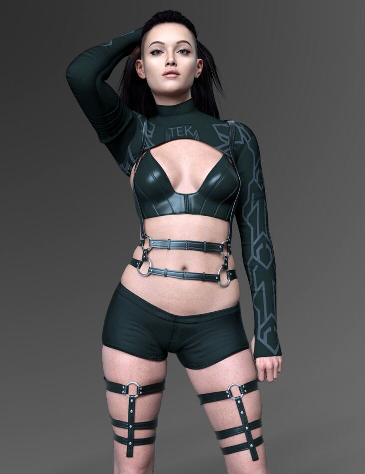 The X-Fashion Tek Outfit for Genesis 9 includes the jacket, top, shorts, harness, and leg harness.