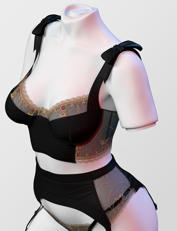 Detailed vintage lingerie is available in 14 material colors, and 04 Saping Presets Bottom, Garter Belt, Stockings, and Top.