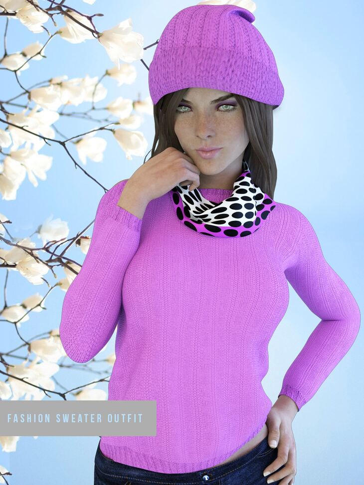 X-FashionSweater is a 3 pieces outfit composed of: Hat, Scarft and Sweater for Genesis 3 Female(s).