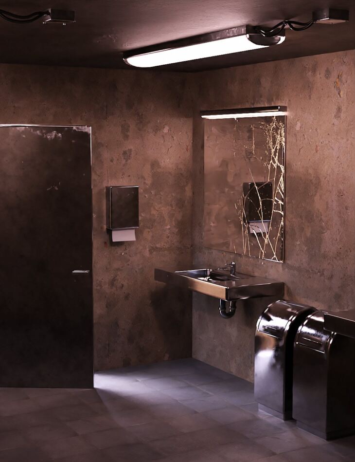 This bathroom comes in three versions, one clean and 2 dirty versions. It's very well suited for a hotel or gas station bathroom.