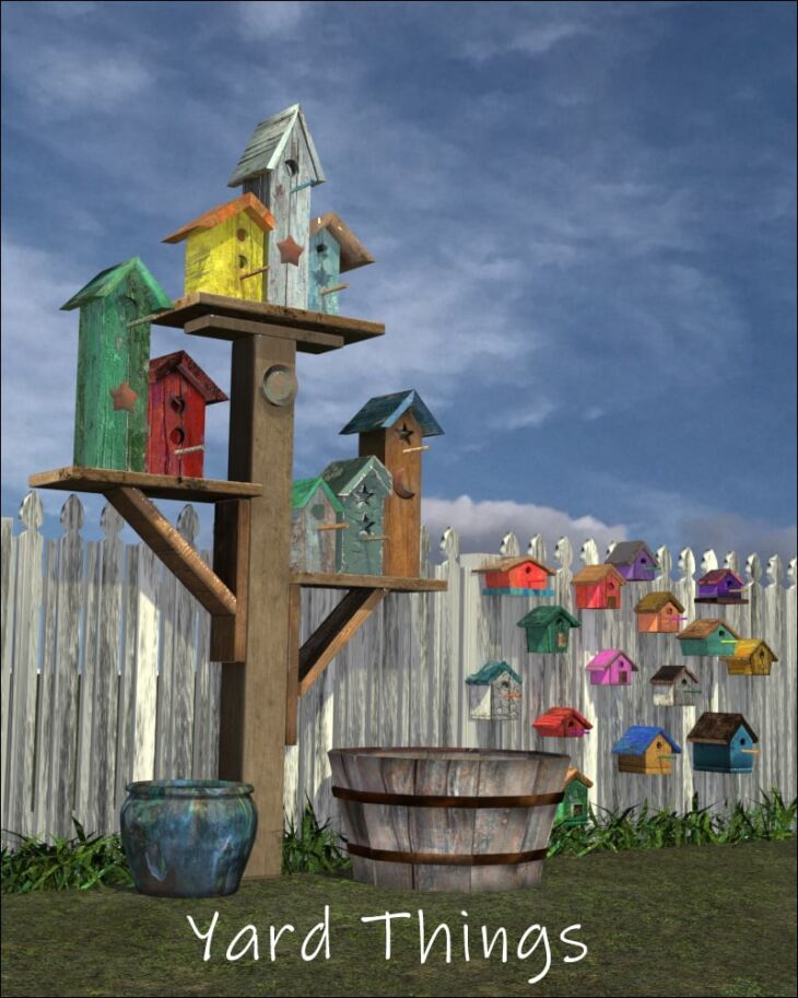 A place for birds to hang out! Includes two bird house building, a skyscraper and condos that fit along a fence. Also includes one fence piece, a barrel planter and a ceramic planter.