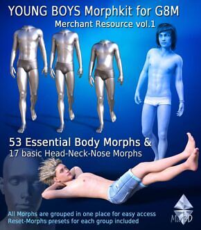 This set contains 6 custom body and 6 custom head shapes to be used with Genesis 8 Male to turn him into a boy of different ages and look.