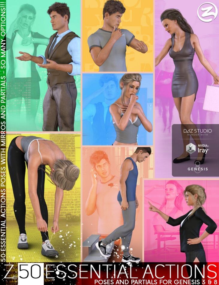 Explore the dynamics of everyday life with this mega pose collection for Genesis 3 and 8. Z 50 Essential Actions - Poses and Partials Collection for Genesis 3 & 8 is a must have set for your library! This set with useful poses will bring your renders to life and make your artwork pop!