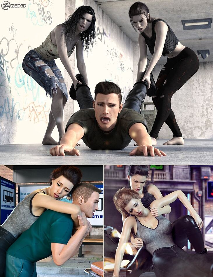 Z Drag, Pull, and Carry Utility Poses for Genesis 8 and 8.1 Male and Female is a collection of versatile interacting poses that will fit various different scenarios.