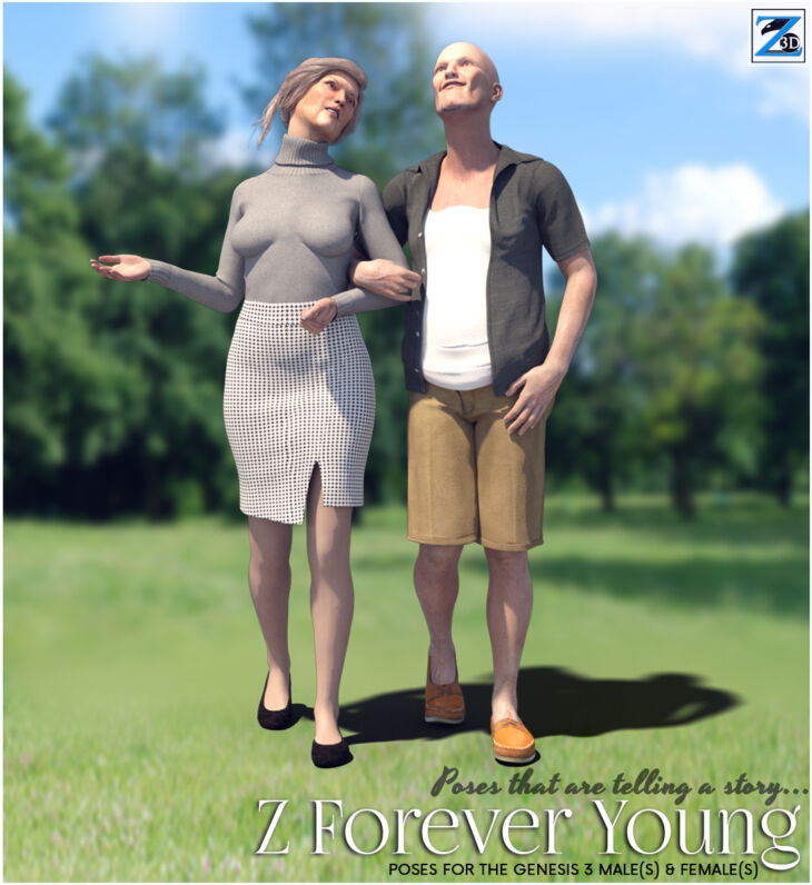 A Brand New G3F-G3M Pose Collection. 20 Sweet Poses for the Genesis 3 Male(s) & Female(s) that remind us that we are only as old as we feel. Mirrors included.