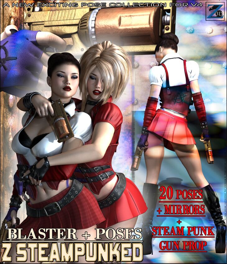Poses for V4, including a SteamPunk blaster smart prop. 20 Full Base Poses + Their Mirrors.