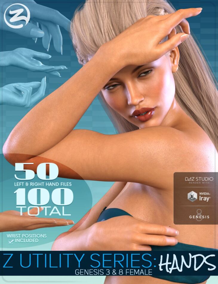 Z Utility Series: Hands is the ultimate Hand Set with 50 Useful Left Hand and 50 Right Hand Poses for Genesis 3 & 8 Female.