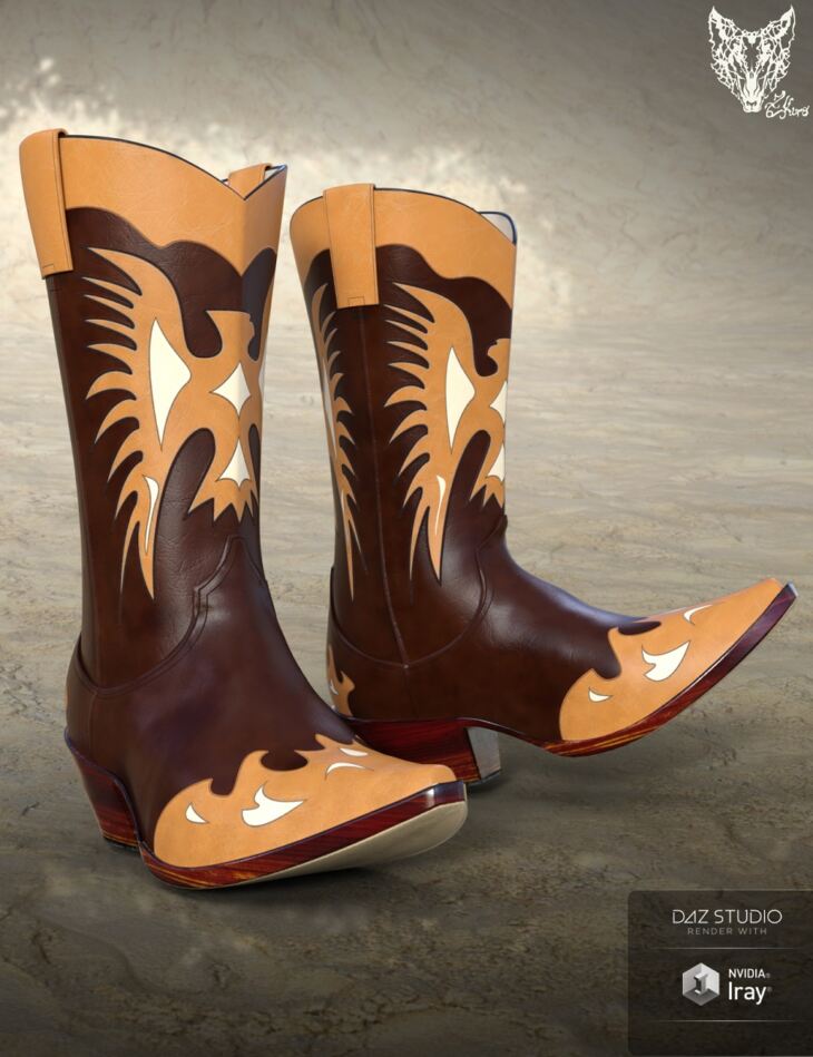 These cowboy boots for Genesis 3 and Genesis 8 Male(s), comes in four colors, Gold-Bordeaux, White Snake-Black, Brown and Black Suede-Gold.