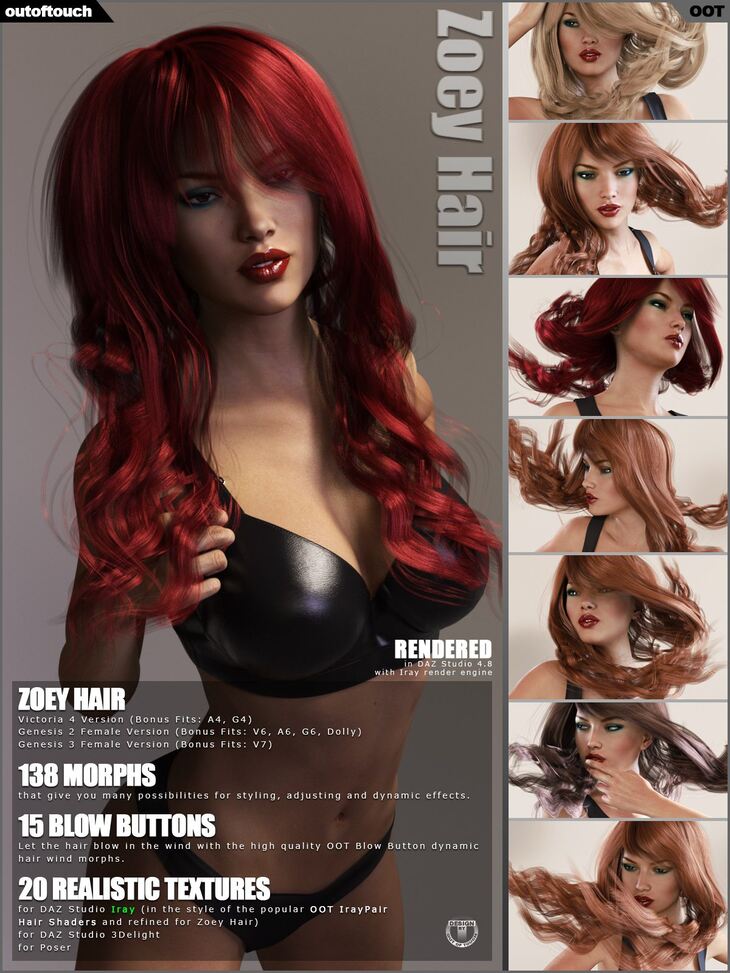 Zoey Hair is a high quality long conforming hair with up-to-date technical goodies. Zoey Hair is both Poser and DAZ Studio compatible.
