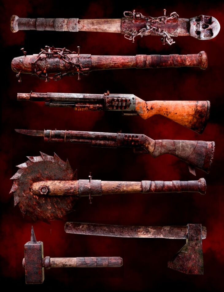 This set is composed of 2 shotguns, 3 baseball bats, 1 axe, and 1 mace. They're available in 4 dirty and gory materials!