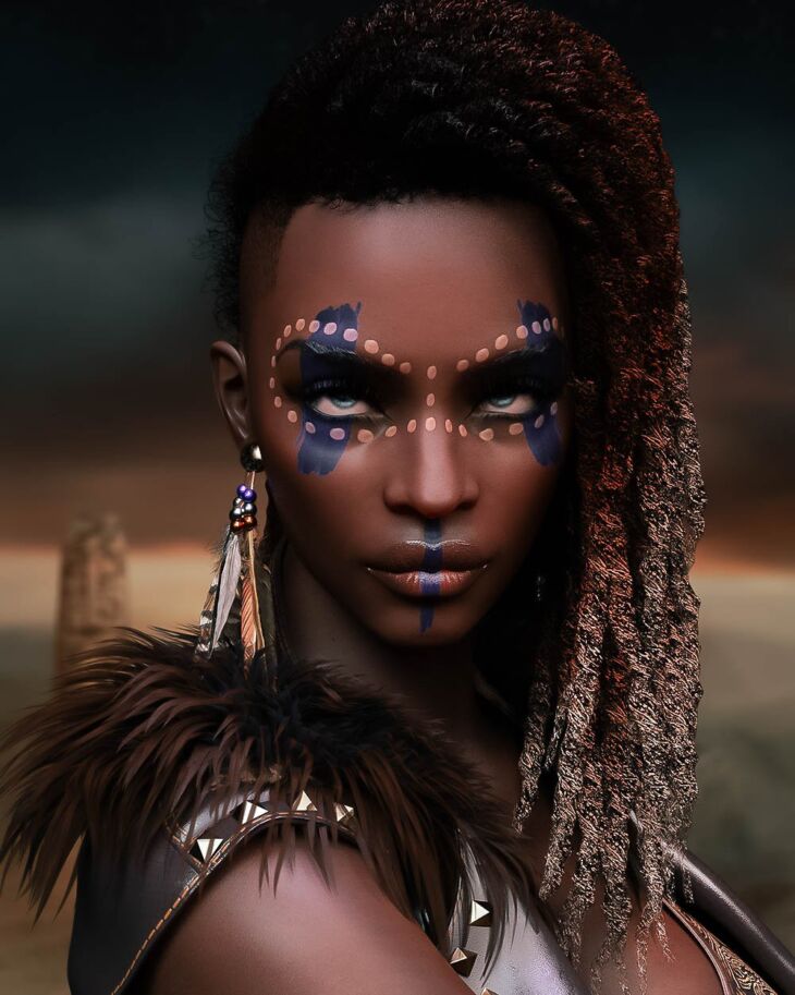 Meet Zuri, a beautiful character for Darcy 8!  Zuri is an African Goddess, a warrior, and a princess who comes with astounding tribal makeup options.  Zuri also comes with Fibermesh eyebrows, lip, eye, makeup, skin and nail options, so you can be sure that she'll be the focus of your next render.