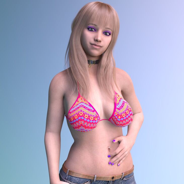 Custom morphs, detailed skin, Including 3 eye colors, 6 eye make up colors, 6 lip colors and a lip gloss option, 6 finger nail colors, eyebrows, and 3 eyelashes.